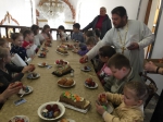 Ключарь Михайловского кафедрального собора вручил воспитанникам воскресной школы пасхальные подарки, а затем ребята продолжили общение за сладким столом.