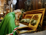 Затем Святейший Владыка совершил молитву и славление у раки с честными мощами святителя Филарета Московского.
