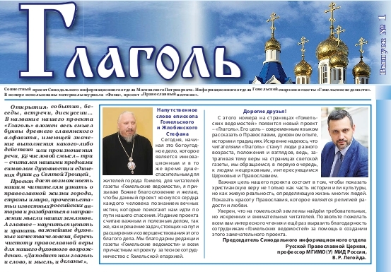 С этого номера на страницах «Гомельских ведомостей» появится новый проект — «Глаголь». Его цель — современным языком рассказать о Православии, духовном опыте, истории и традициях. Искренне надеюсь, что читателями «Глаголь» станут люди разного возраста, положения и взглядов, ведь, затрагивая тему веры на страницах светской газеты, мы обращаемся, в первую очередь, к людям нецерковным, интересующимся Церковью и Православием. Важная цель нашего проекта состоит в том, чтобы показать христианскую веру не только как часть истории или культуры, но как живую реальность, определяющую жизнь многих людей. Показать красоту Православия, которое является религией радости и любви. Уверен, что на гомельской земле мы найдем требовательных, но искренних и внимательных читателей. Позвольте пожелать всем вам интересного чтения и еще раз выразить благодарность сотрудникам «Гомельских ведомостей» за помощь в создании этого замечательного проекта.