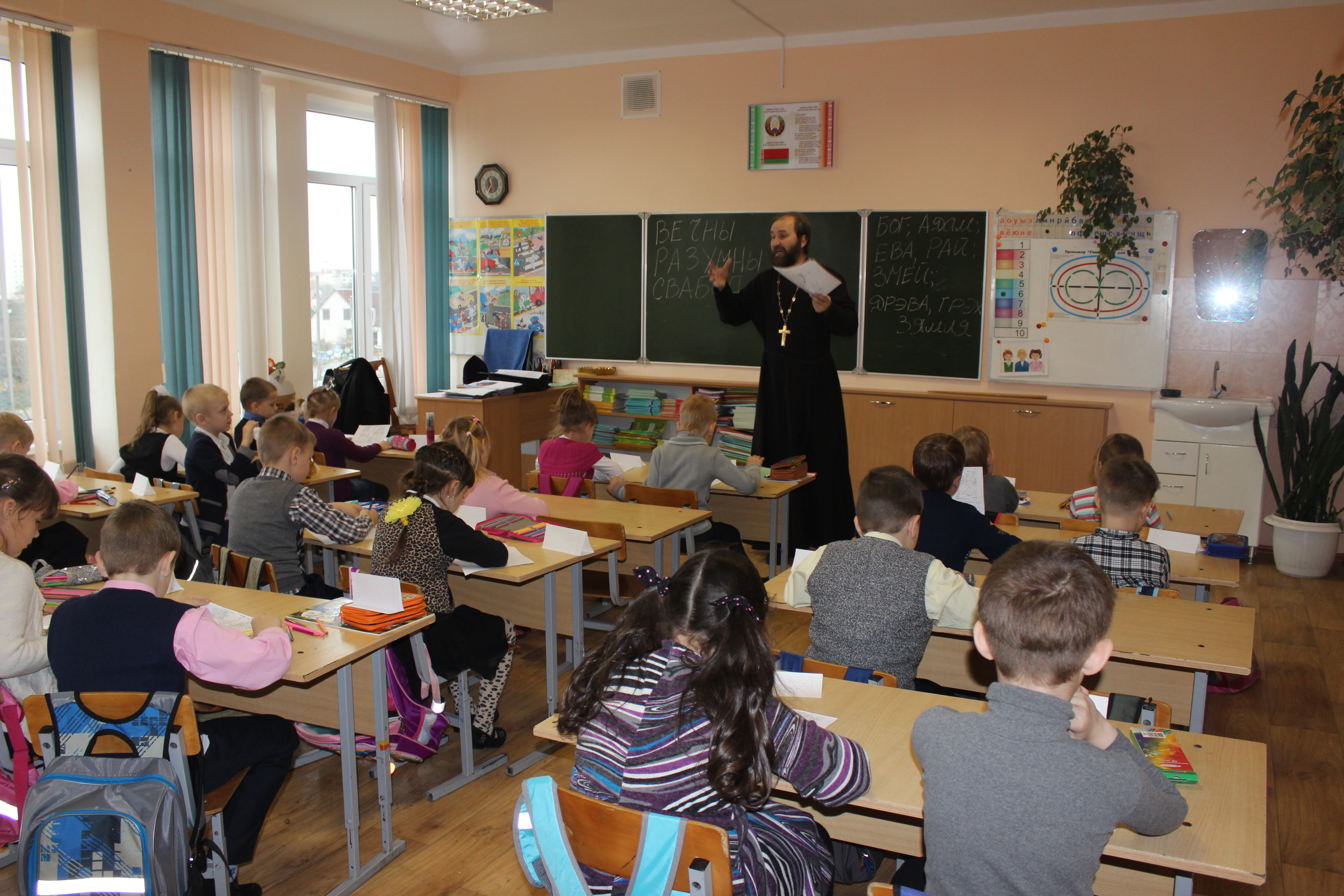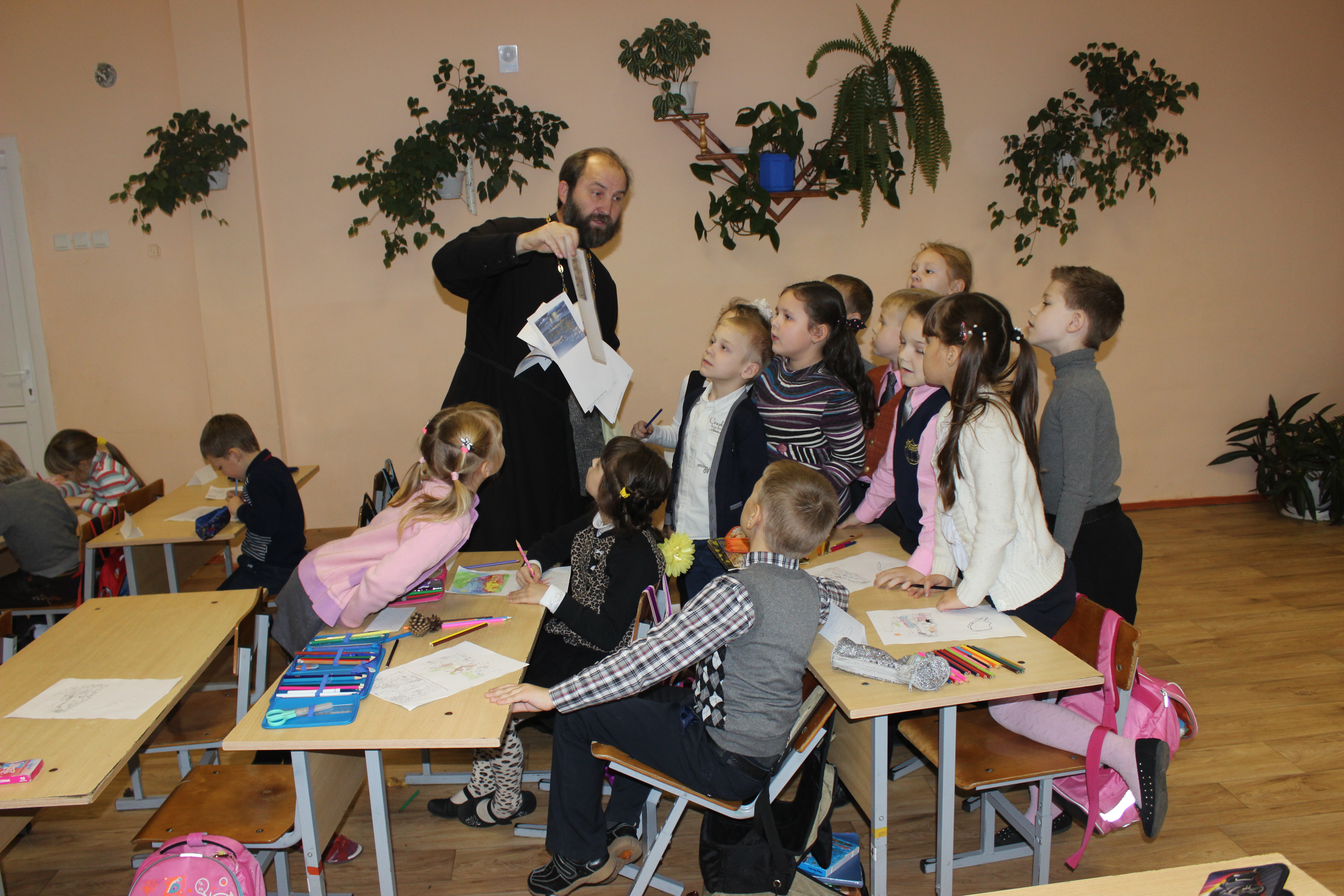 Также отец Георгий в этот день встретился с ребятами из 5-го класса. Он рассказал учащимся о библейской версии возникновения зла на земле.